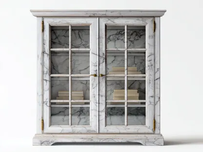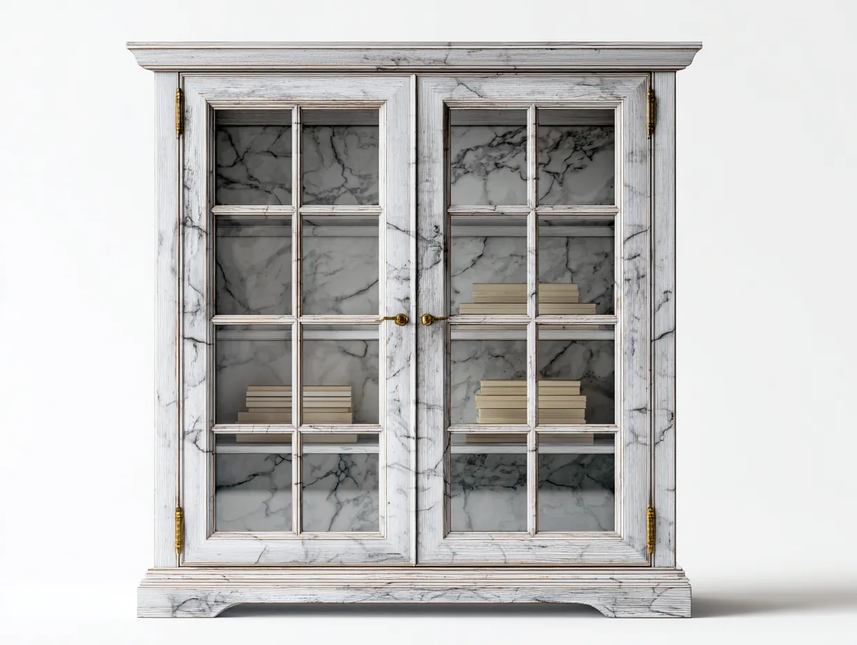 La estructura está fabricada en madera procesada resistente con acabado blanco efecto mármol que aporta durabilidad y una apariencia sofisticada. Las puertas incluyen paneles de vidrio transparente que permiten ver el contenido interior mientras protegen los objetos del polvo. Las bisagras metálicas ofrecen un funcionamiento estable y seguro en el uso diario.