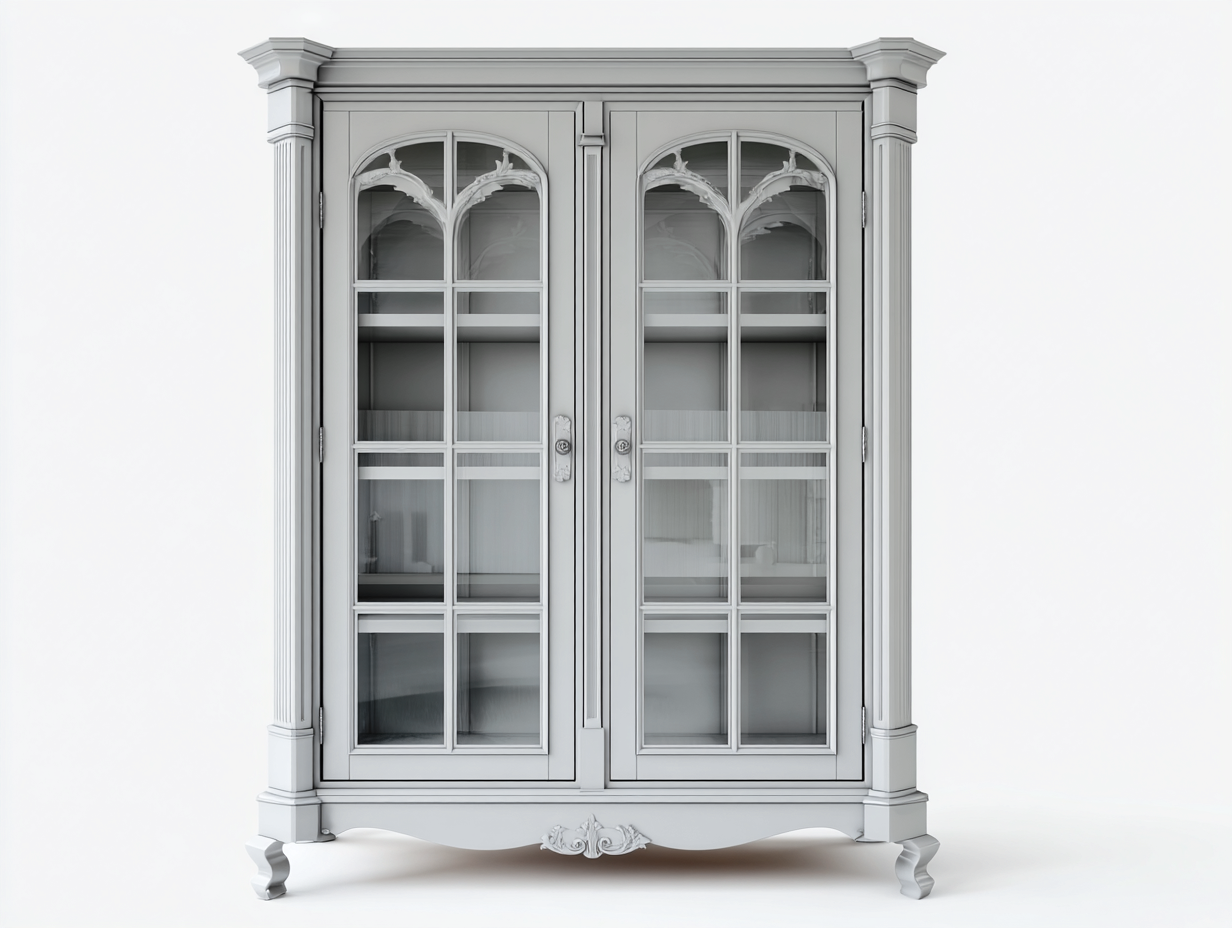 Fabricada en madera procesada resistente con acabado en color gris claro. Las puertas incorporan paneles de vidrio transparente que permiten una visualización clara del interior. Los detalles decorativos superiores y las columnas laterales aportan una estética clásica que se integra fácilmente en interiores elegantes.