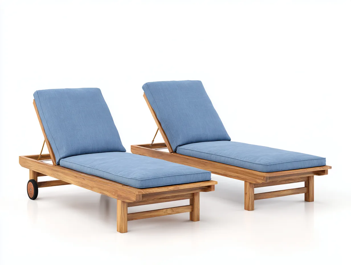 La estructura está fabricada en madera resistente tratada para uso exterior con acabado en color natural. Este material aporta estabilidad y una apariencia cálida que se integra bien en espacios exteriores. Los cojines acolchados en color azul proporcionan una superficie cómoda para el descanso.